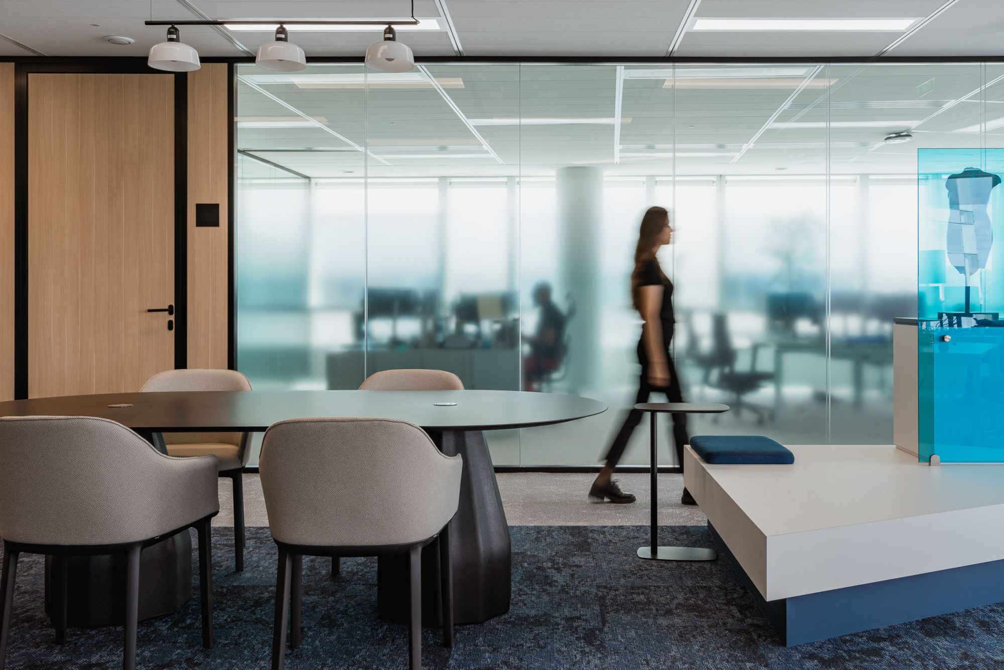 Les contraintes architecturales de la tour Keiko — plateaux anguleux, espaces interstitiels — ont été transformées en opportunités créatives. Ces zones ont donné naissance à des podiums multifonctions, à la fois supports de scénographie, espaces de travail informels et lieux de rencontre, mêlant hospitalité et usage.