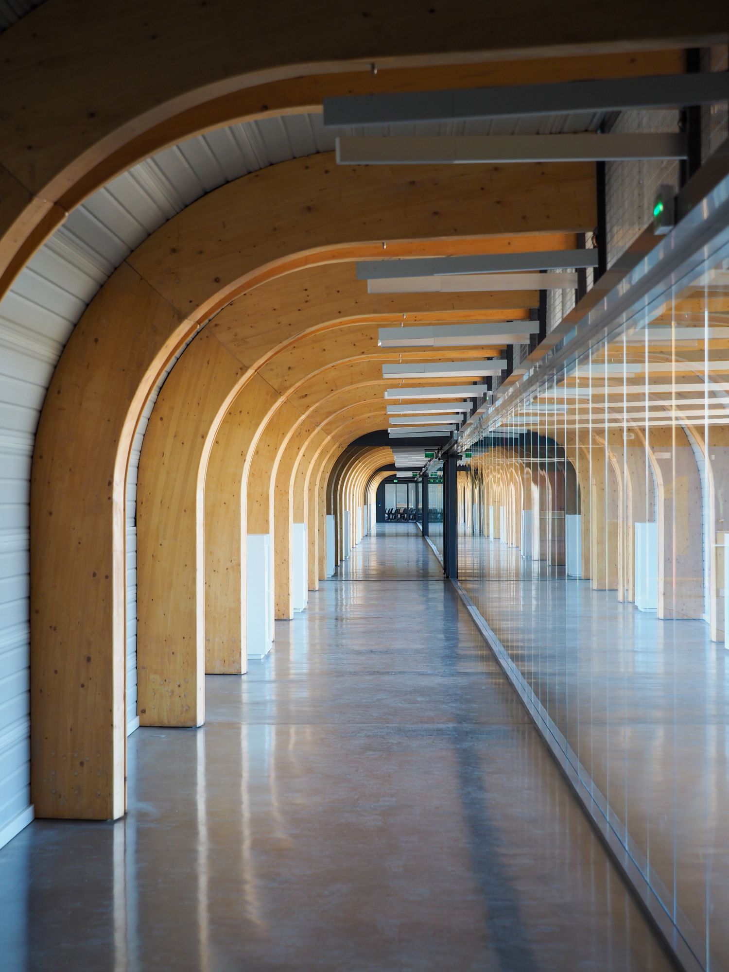 La galerie de liaisons, très largement vitrée, est conçue comme une passerelle/pont pour enjamber l’aire de manœuvre et permet de préserver de futurs travaux de l’extension.